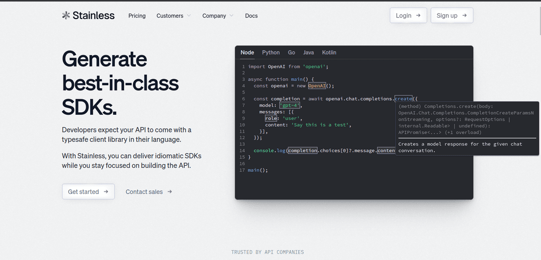 Companies such as OpenAI, Cloudflare, and Anthropic uses Stainless API, which makes it well-suited for larger projects where customization and code quality are paramount. It’s ideal for enterprises and development teams that need to ensure their SDKs adhere to specific standards and practices.